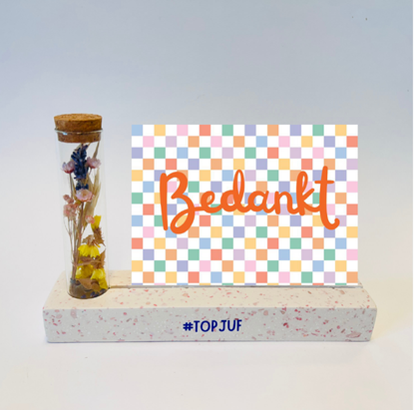 Deze kaartenhouders zijn er ook met een lieve of grappige tekst speciaal voor juf of meester.