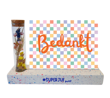 Inclusief een glazen buisje met een droogbloemmetje, perfect om een kaartje, quote, tekening of foto stijlvol te presenteren. Kleine luchtbelletjes zijn mogelijk en maken deel uit van het ambachtelijke karakter.